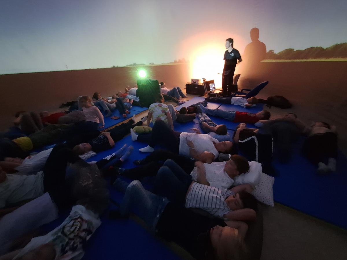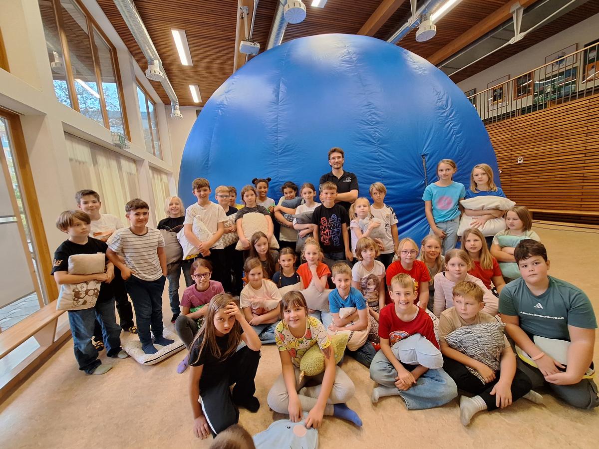 Am Donnerstag, den 23. Oktober 2025 hat uns das mobile Schulplanetarium besucht. Die Klassen Piranhas, Rote Pandas und Alpakas durften in der großen, dunklen Kuppel gemütlich in die Sterne schauen. Vorführer Lennart erklärte uns anschaulich das Sonnensystem und zeigte viele spannende Sternbilder und Planeten.