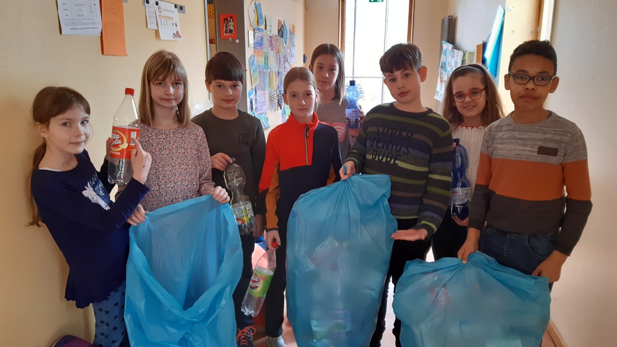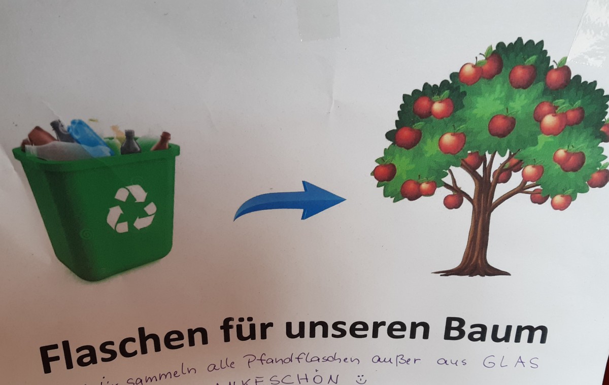 Ganz einfach: Wir wollen einen Baum pflanzen und finanzieren diese Aktion, in dem wir PET-Flaschen sammeln. Wenn jeder Schüler 10 davon mitbringen könnte...kann der Baum gepflanzt werden.