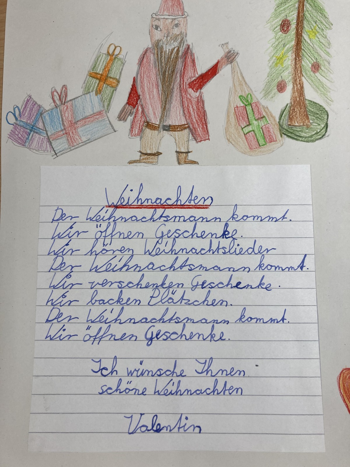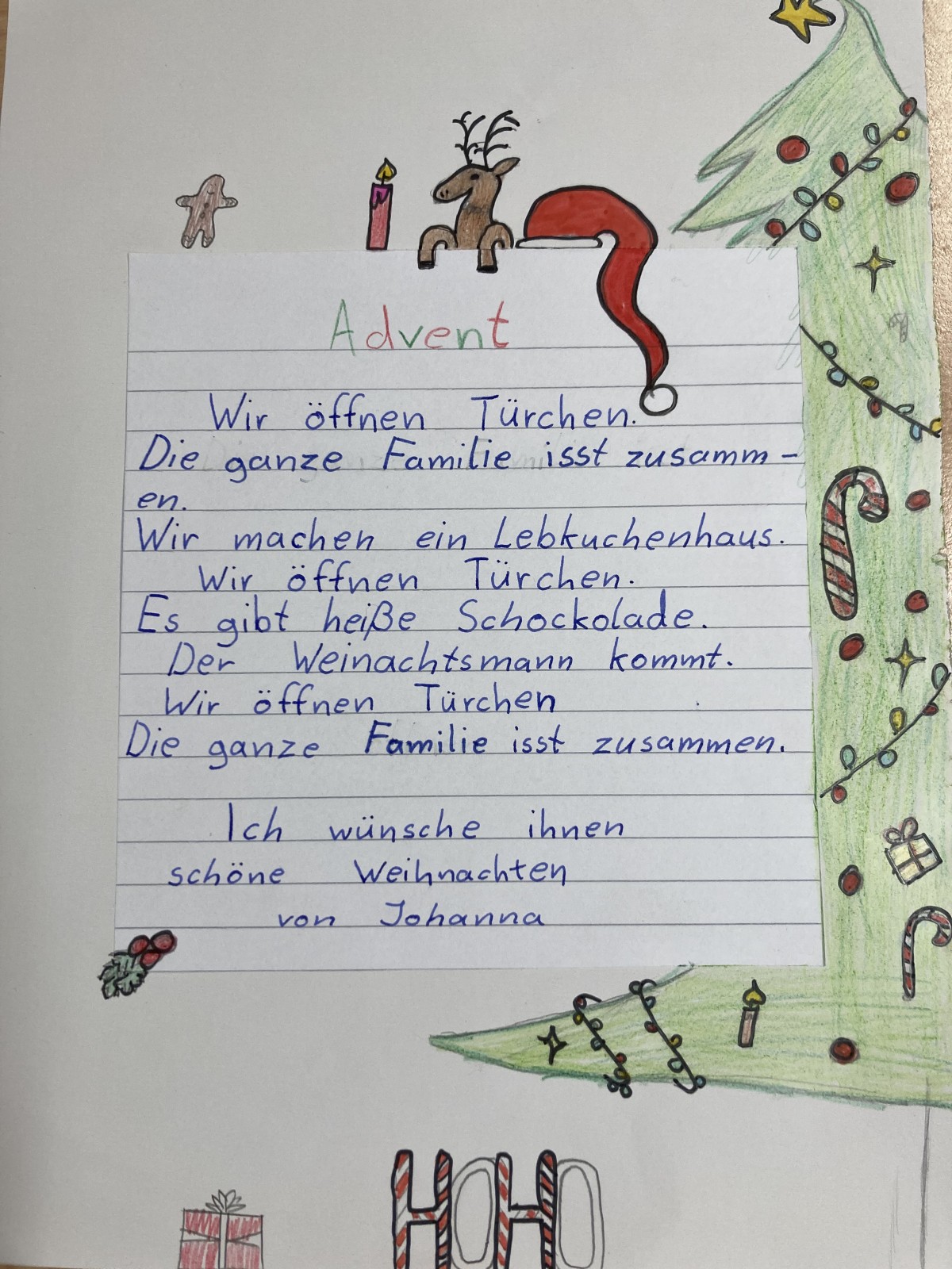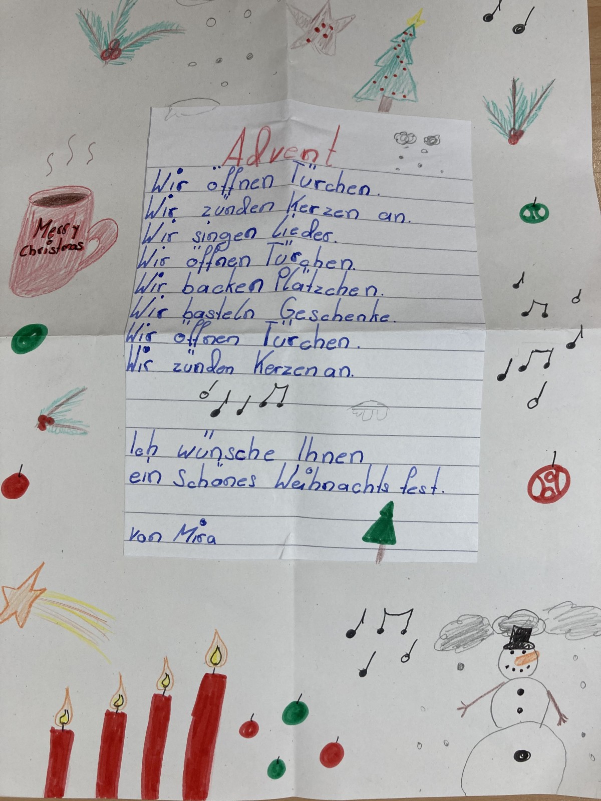 Unter dieser Überschrift rief die Freiwilligenagentur auf, einen Weihnachtsgruß für einsame Menschen zu schreiben. Wir Panther haben uns daran beteiligt. Wir haben kleine Gedichte geschrieben und dazu gemalt. So konnten wir 23 Wichtelbriefe abgeben. Wir hoffen, dass wir damit Menschen, die zu Weihnachten allein oder traurig sind, ein Lächeln aufs Gesicht zaubern können.